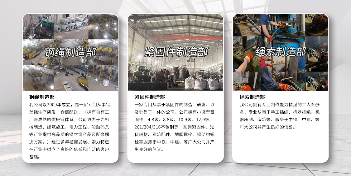深耕钢丝绳与紧固件行业,拥有成熟制造经验与市场理解。 自有工厂,品质可控:生产过程严格执行ISO9001等质量管理体系标准。